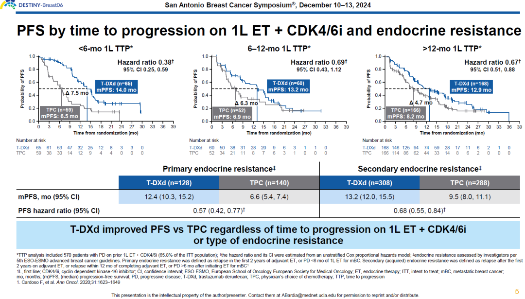 [6]Aditya Bardia,Xichun Hu,Rebecca Dent,et al.2024 SABCS LB1-04:Efficacy and safety of trastuzumab deruxtecan(T-DXd)vs physicians choice of chemotherapy(TPC)by pace of disease progression on prior endocrine-based therapy:additional analysis from DESTINY-Breast06.2024 SABCS abs#3676