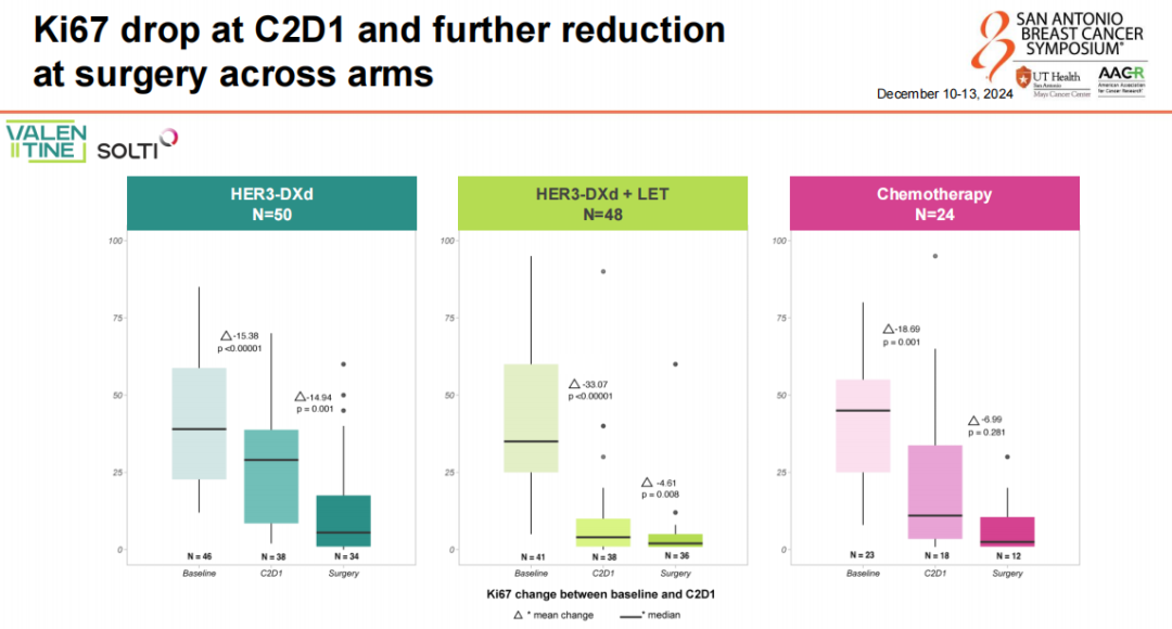 然而,通过仔细分析Ki67在第2周期第1天(C2D1)的下降程度和手术时的组织样本,我们发现HER3-DXd单药组、HER3-DXd联合内分泌治疗组的Ki67下降水平明显优于化疗组。此外,PAM50风险评分的变化(从高/中风险评分在基线时转变为手术时的低风险评分)及PAM50亚型的变化(从手术时的PAM50 Luminal B转变为较少增殖的Luminal A/Normal-like)也值得我们深入思考。同时,在毒副反应方面,HER3-DXd单药组、HER3-DXd联合内分泌治疗组的不良反应也少于化疗组。