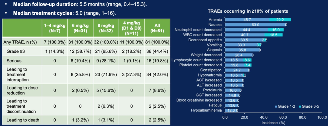 从安全性角度来看,目前数据显示,6mg剂量组中3级以上不良事件的发生率低于40%,表明该药物具有较好的耐受性。大部分不良反应集中在血液毒性和胃肠道毒性方面,整体耐受性可接受。综合考虑疗效和安全性,该药物确实值得进一步研究和探索。
