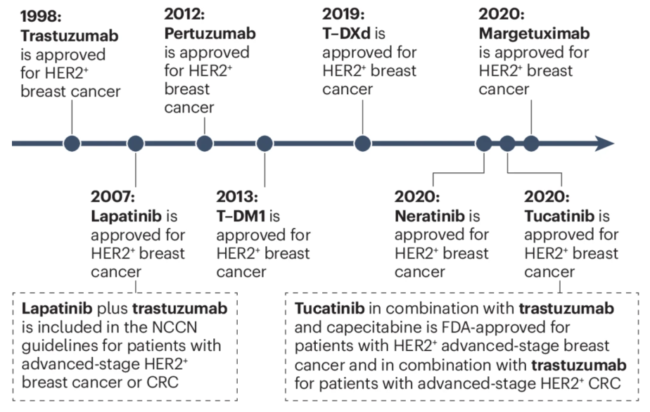 20世纪80年代,研究者首次发现约20~30%的乳腺癌患者存在ERBB2扩增,致使肿瘤细胞膜上HER2酪氨酸激酶受体过表达,造成较差的预后。随后针对HER2开发的抗体中最有效的是一种名为4D5的鼠源分子,其被人源化后即大众熟知的曲妥珠单抗。1998年,美国食品药品监督管理局(FDA)批准了曲妥珠单抗用于治疗HER2阳性乳腺癌,成为了全球首个靶向HER2精准治疗药物。其后的二十余年中,靶向HER2的大分子单抗帕妥珠单抗,TKI药物拉帕替尼、奈拉替尼、图卡替尼,ADC药物恩美曲妥珠单抗(T-DM1)、德曲妥珠单抗(T-DXd)等药物相继获批,为抗HER2治疗带来了更多选择。