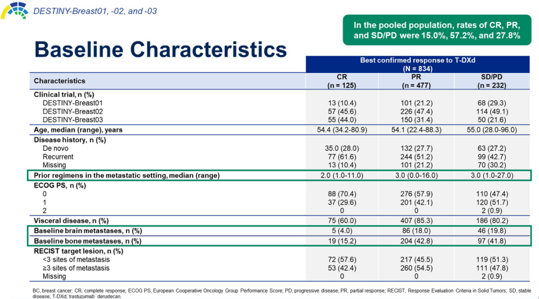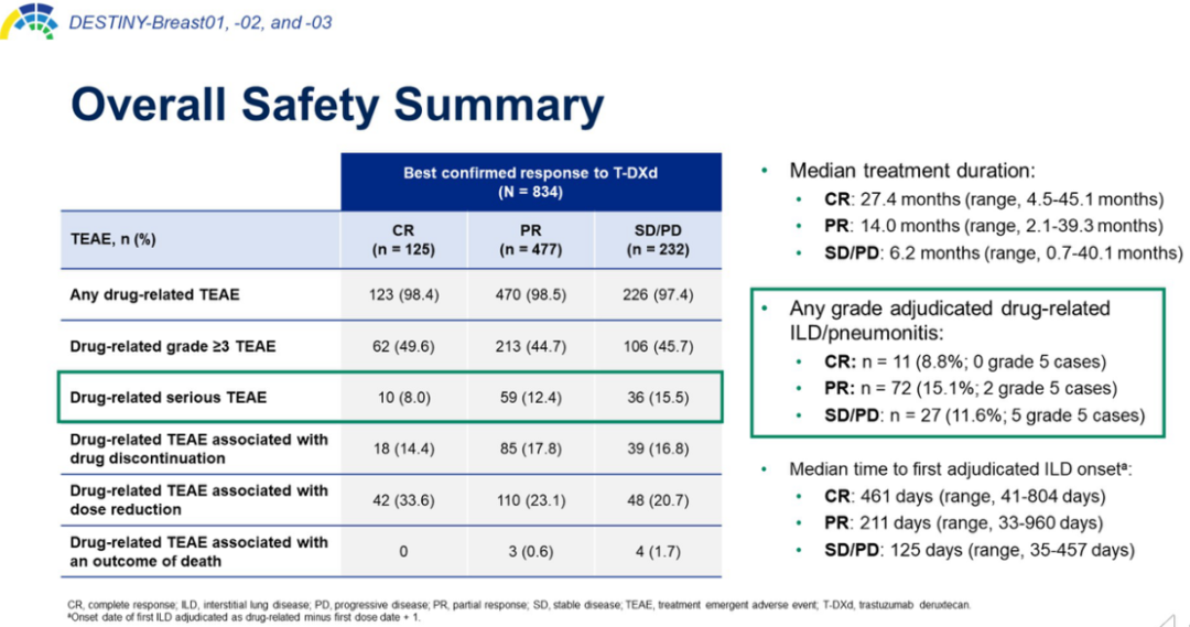 达到CR的患者在晚期治疗中接受过的治疗方案中位数为2(范围:1~11)线,而达到PR或SD/PD的患者接受过中位治疗为3线。与PR或SD/PD患者相比,CR患者的PFS和OS结局更好。达到CR的患者发生与药物相关、治疗期间严重的不良事件(TEAEs)的比例在数值上低于达到PR(8.0%vs 12.4%)或SD/PD(15.5%)患者。与PR或SD/PD患者相比,CR患者因T-DXd导致药物相关TEAEs而停药的比例也较低(14.4%vs 17.8%vs 16.8%),且药物相关间质性肺病(ILD)/肺炎的发生率也较低(8.8%[0例致死]vs 15.1%[2例致死]vs 11.6%[5例致死]),首次ILD发病的中位时间也更长(461天vs 211天vs 125天)。