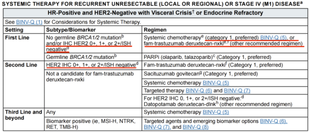 在2025年V1版的NCCN指南中:(1)对于内脏危象或内分泌难治性的HR+/HER2-晚期乳腺癌患者,新增T-DXd作为一线治疗的其他推荐方案,并作为二线治疗的优选方案,且两个治疗推荐的人群均由既往的HER2低表达(HER2 IHC 1+或2+/ISH-)扩大至HER2超低表达(HER2 ICH 0+)。