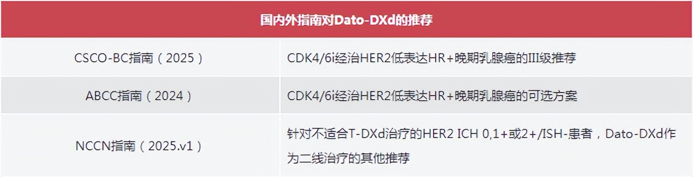 在2025年V1版的NCCN指南中:针对不适合T-DXd治疗的HER2 ICH 0,1+或2+/ISH-患者,新增Dato-DXd作为二线治疗的其他推荐。