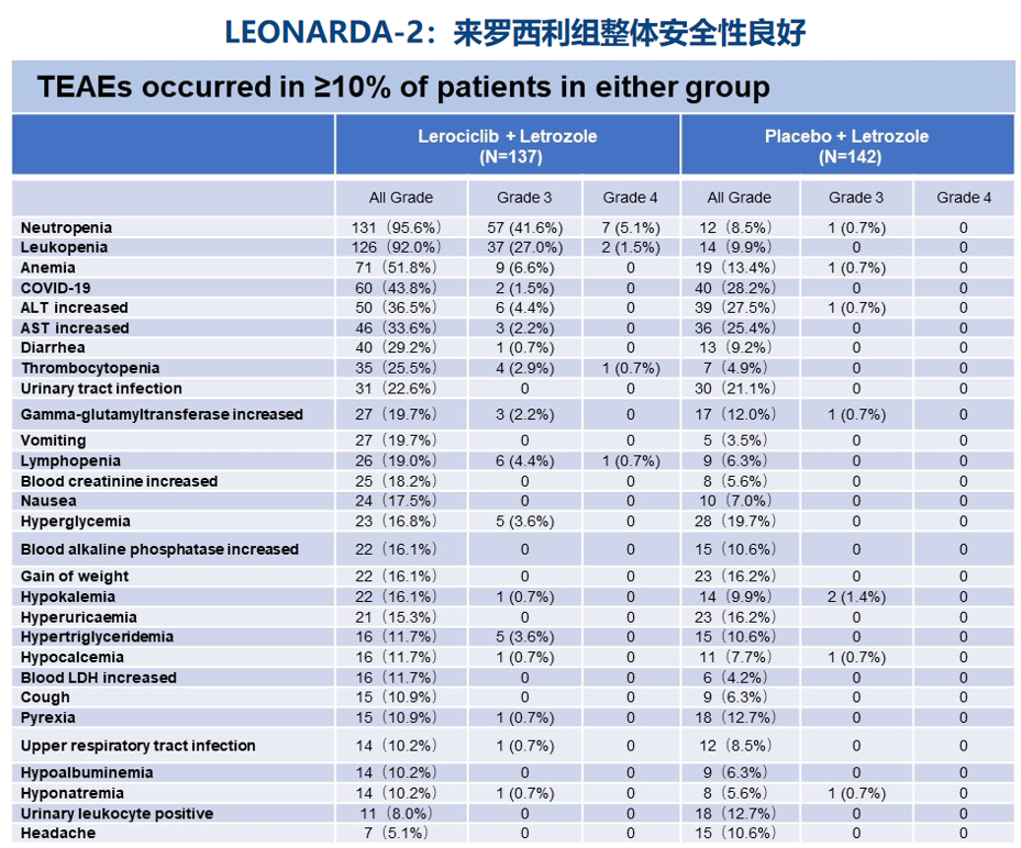 2、Xichun Hu,et al.LEONARDA-2:Lerociclib plus letrozole versus placebo plus letrozole in HR+/HER2-advanced or metastatic breast cancer.2024 ASCO abstract 1052