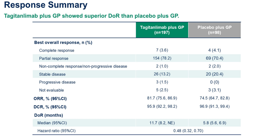 在肿瘤缓解方面,与单独化疗组相比,塔戈利单抗联合化疗组具有更高的ORR(81.7%vs 74.5%);中位持续治疗缓解时间(DoR)延长近1倍(11.7 vs 5.8个月;HR 0.48,95%CI:0.32-0.70)。OS数据尚未成熟,但已显示出塔戈利单抗联合化疗组的获益趋势,目前死亡风险降低38%(HR 0.62,95%CI:0.32-1.22);此外,安全性与既往报道一致,患者的治疗耐受性良好。
