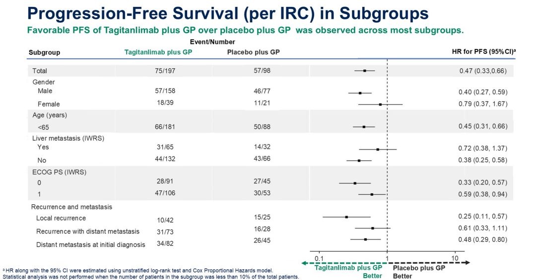 随后,我们进一步开展了这项III期临床研究[11],旨在评价塔戈利单抗联合GP作为R/M NPC患者一线治疗的疗效和安全性。此次ASCO大会口头报告披露的数据显示到达主要研究终点:与单独化疗组相比,塔戈利单抗联合化疗组具有更长的PFS(NR vs 7.9个月),疾病进展或死亡风险显著降低53%(HR 0.47,95%CI:0.33-0.66,单侧P<0.0001);而且在不同亚组中,塔戈利单抗联合化疗均有一致获益。