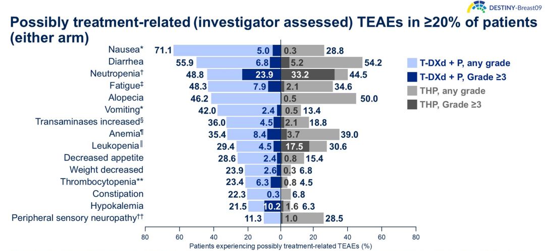 从近期疗效来看,T-DXd+P具有强效持久的肿瘤缓解效果。T-DXd+P组的ORR高达85.1%,高于THP组的78.6%;其中T-DXd+P组的完全缓解(CR)率相较于THP组提高了1倍(15.1%vs 8.5%);两组的中位持续缓解时间(DoR)分别为39.2个月26.4个月。这些数据再次证实了T-DXd具有强大的肿瘤退缩作用,优化传统化疗方案。尤其对于需要快速控制肿瘤的高瘤负荷患者而言,T-DXd能够起到“立竿见影”的效果,大大增强医生和患者的治疗信心。