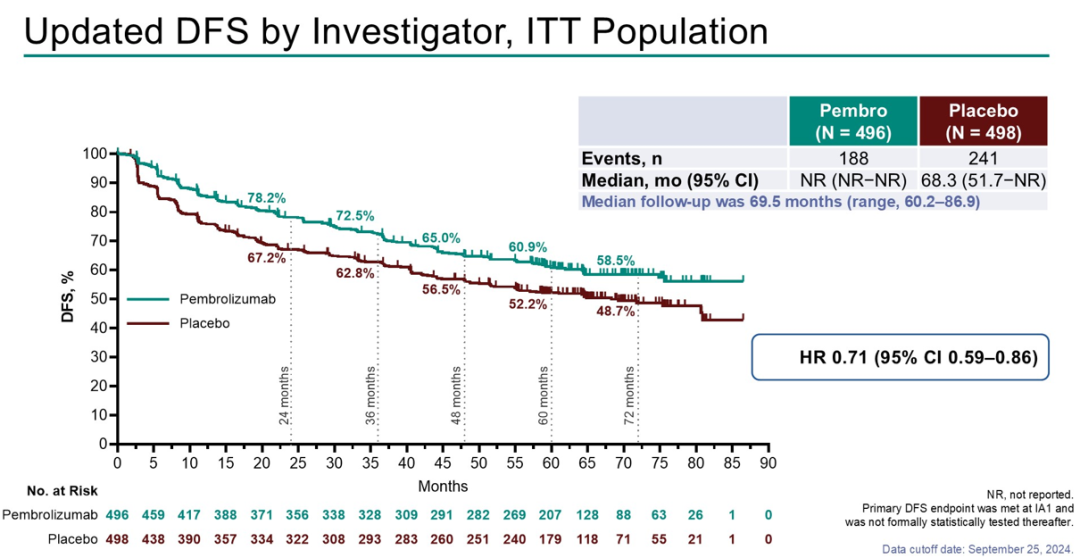 共994例患者被随机分配接受帕博利珠单抗(n=496)或安慰剂(n=98)治疗。截至2024年9月25日的数据截止日期,中位随访时间为69.5个月。所有患者在3年前完成了或停止了研究治疗。帕博利珠单抗组和安慰剂组分别发生了188例和241例DFS事件。中位DFS未达到(NR),而安慰剂组为68.3个月(HR 0.71,95%CI0.59-0.86);5年时的估计DFS率分别为60.9%和52.2%。帕博利珠单抗组和安慰剂组分别发生了68例和99例OS事件。两组的中位OS均为NR(HR 0.66,95%CI 0.48-0.90);5年时的估计OS率分别为87.7%和82.3%。DFS和OS结果在包括预先规定的风险和肉瘤样特征在内的关键亚组中是一致的。在3年内没有报告新的严重治疗相关不良反应。