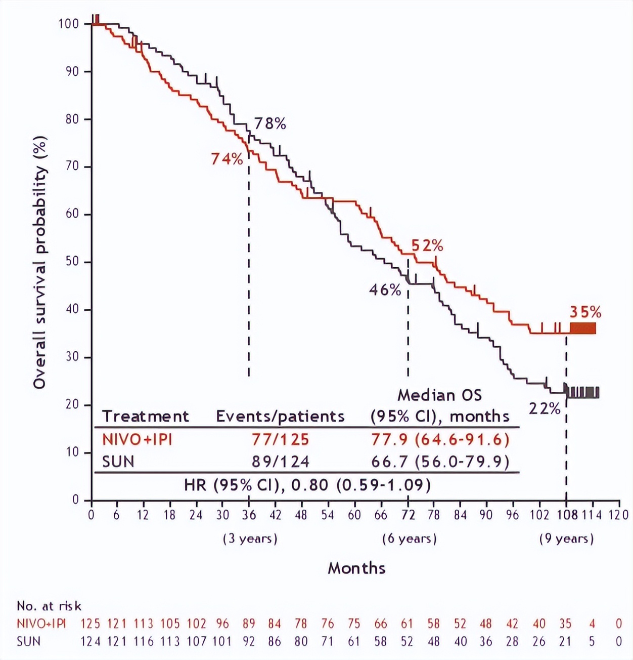 中位随访9年后,相比于舒尼替尼,纳武利尤单抗联合伊匹木单抗治疗后ITT人群(HR 0.71)和中危/高危人群(HR 0.69)的OS得到改善。ITT患者和中危/高危患者108个月OS率分别为31%(vs对照组20%)和30%(vs对照组19%)。在低危患者中,OS的HR从首次报告时的1.45降低至目前的0.80,显示了纳武利尤单抗联合伊匹木单抗的延迟获益。低危患者108个月OS率为35%(vs对照组22%)。纳武利尤单抗联合伊匹木单抗治疗96个月的PFS率在ITT患者中为23%(vs对照组9%),中危/高危患者为25%(vs对照组9%),低危患者为13%(vs对照组11%)。纳武利尤单抗联合伊匹木单抗的96个月持续应答率在ITT患者为48%(vs对照组19%),中危/高危患者50%(vs对照组23%),低危患者36%(vs对照组NA)。两组均未发生新的治疗相关死亡。将进行额外的亚组分析。