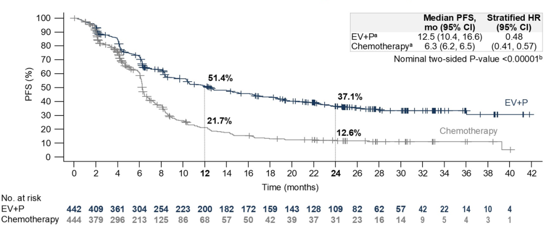 [5].Powles T,Van Der Heijden M S,Loriot Y,et al.EV-302:Updated analysis from the phase 3 global study of enfortumab vedotin in combination with pembrolizumab(EV+P)vs chemotherapy(chemo)in previously untreated locally advanced or metastatic urothelial carcinoma(la/mUC)[J].JCO 43,664-664(2025).