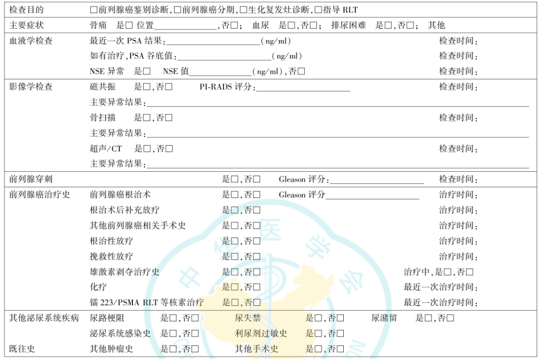 推荐意见:建议采用前列腺癌患者PSMA PET检查结构化病史框架进行病史采集。