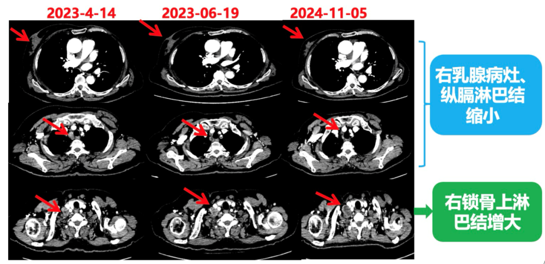 2024-11-5复查CT:右乳外上象限占位(11mm×9mm),较前明显缩小;上纵隔及右肺门多发淋巴结转移缩小;右锁骨上区淋巴结较前增大。余部位未见肿瘤转移及复发征象。