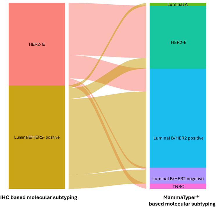 研究队列包含两种分子亚型:HER2+/管腔B亚型(HER2+、ER+、PR+/-),HER2+/非管腔亚型(HER2+、ER-和PR-)。最终纳入了287例具有福尔马林固定石蜡包埋样本和有效MammaTyper结果的病例进行分析。