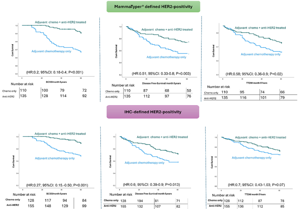 这项研究旨在评估基于mRNA的多基因检测在预测HER2+乳腺癌患者的抗HER2治疗的疗效作用,并对比了MammaTyper分类和传统IHC分类的差异。研究结果表明,MammaTyper检测可以客观且准确地评估HER2状态,对治疗结果具有重要意义。未来的研究需要进一步改进这些技术,并在更大、更多样化的队列中验证其临床实用性。