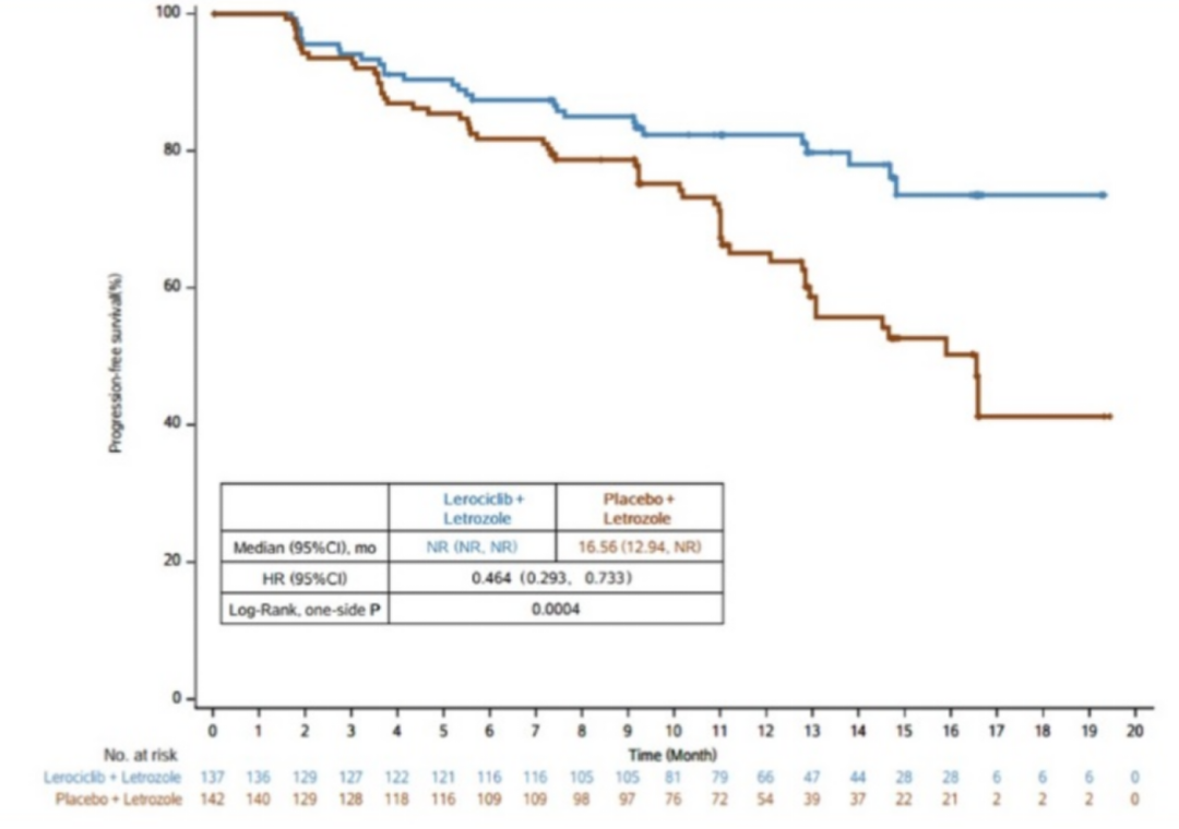△LEONARDA-2研究:研究者评估来罗西利+来曲唑对比来曲唑用于初治晚期患者的中位PFS分别是未达到(NR)和16.56个月,来罗西利组的疾病进展或死亡风险显著下降53.6%(HR 0.464;95%CI 0.293–0.733;P=0.0004)