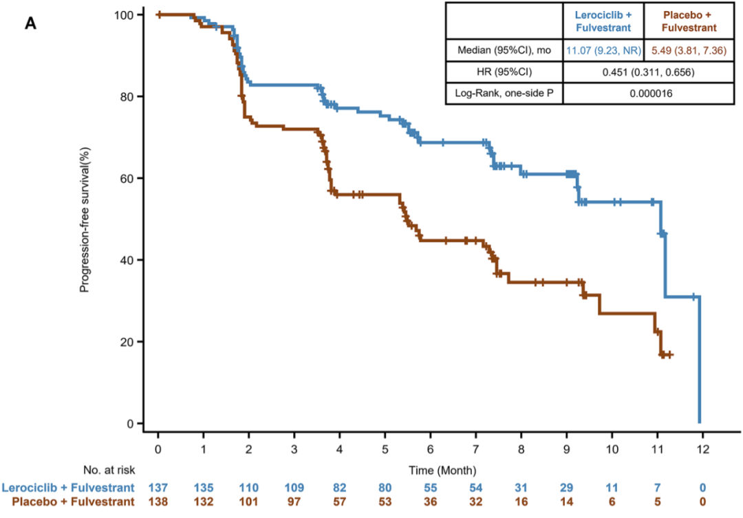 △LEONARDA-1研究:来罗西利+氟维司群对比安慰剂+氟维司群用于ET耐药患者的中位PFS分别是11.07个月和5.49个月,疾病进展或死亡风险显著下降54.9%(HR 0.451;95%CI 0.311–0.656;P<0.0001)