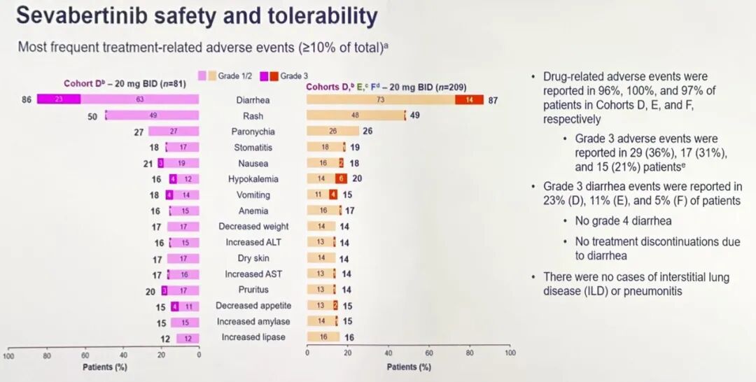 ☆最常见的不良反应是腹泻,未报告间质性肺病(ILD)或肺炎病例。队列D中69%、队列E中100%、队列F中97%的患者发生了药物相关不良事件;分别有36%、31%和21%的患者报告了3级AE。值得注意的是,队列D中23%、队列E中11%、队列F中5%的患者发生了3级腹泻事件。未在任何患者中观察到ILD或肺炎。