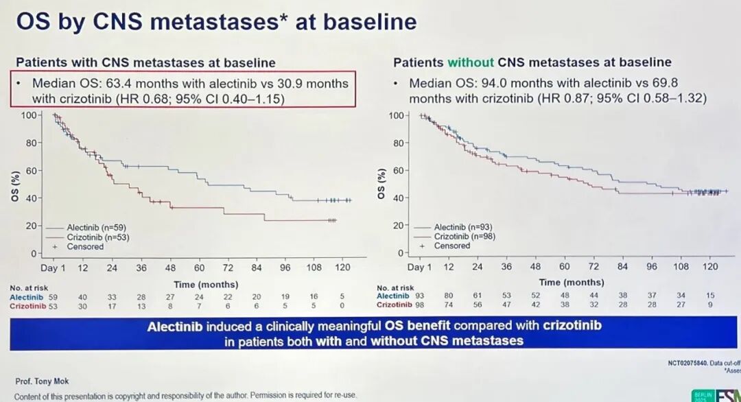 ☆关于基线存在CNS转移患者的OS,阿来替尼组(n=59)的中位OS为63.4个月,而克唑替尼组(n=53)为30.9个月,死亡风险降低了32%(HR=0.68;95%CI:0.40-1.15)。对于基线无CNS转移的患者,阿来替尼组(n=93)的中位OS为94.0个月,克唑替尼组(n=98)为69.8个月(HR=0.87;95%CI:0.58-1.32)。