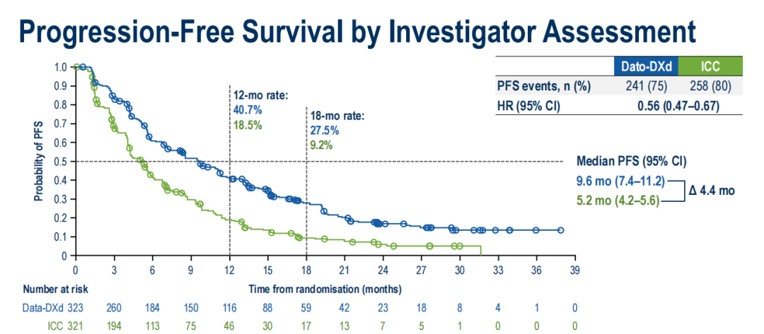 Dato-DXd组vs ICC组(BICR评估):10.8个月vs 5.6个月,HR 0.57(95%CI:0.47-0.69);P<0.0001。Dato-DXd组相较于化疗组使患者中位PFS延长5.3个月,疾病进展或复发风险降低43%。研究者评估的PFS与BICR评估的PFS一致。