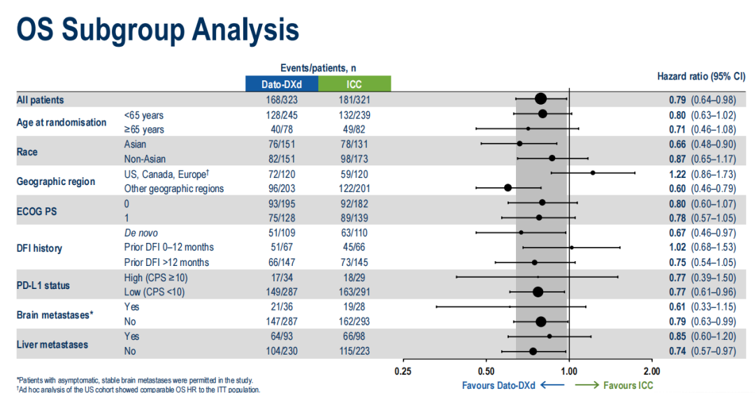 亚组分析显示,无论患者年龄、地区、PD-L1状态、DFI时间、既往是否有脑和肝转移,接受Dato-DXd治疗的患者均有一致的PFS和OS获益。