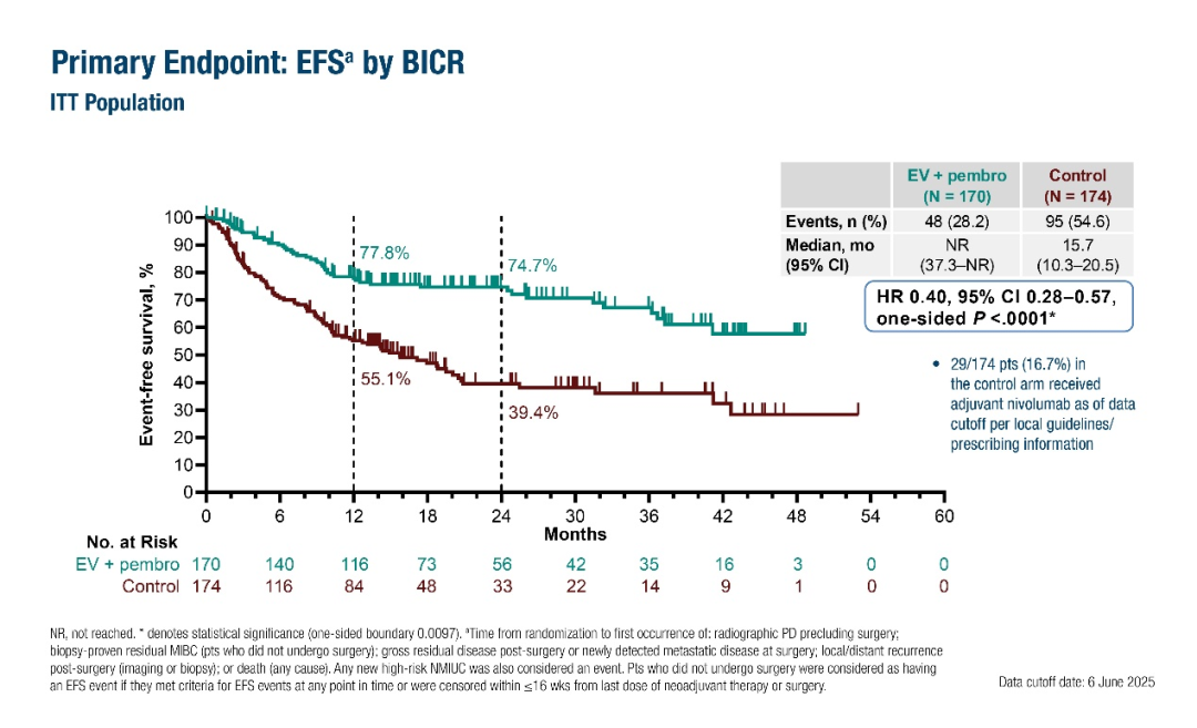在III期KEYNOTE-905/EV-303研究中,344名不耐受顺铂的MIBC患者在标准手术中加入了维恩妥尤单抗和帕博利珠单抗治疗,结果显示靶免治疗可显著改善主要终点EFS(中位未达到vs 15.7个月;HR 0.40;95%CI 0.28-0.57;P<0.0001)和OS(NR vs 41.7个月;HR 0.50;95%CI 0.33-0.74;P=0.0002)。围手术期治疗的病理完全缓解(pCR)率也显著提高(57.1%vs.8.6%;估计差异48.3%;95%CI 39.5%-56.5%;P<0.000001),远高于通常采用顺铂为基础的新辅助化疗所达到的水平。