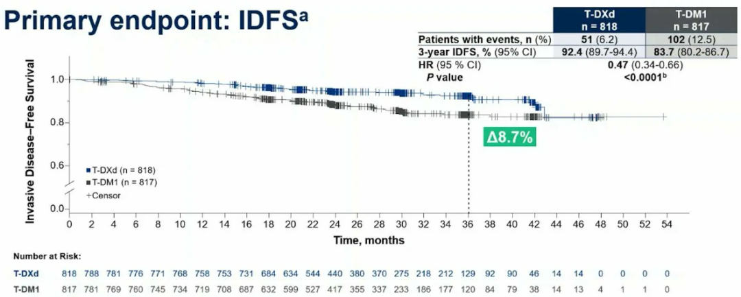 此次公布的研究期中分析结果显示:T-DXd组的三年IDFS率为92.4%(95%CI:89.7–94.4),而T-DM1组为83.7%(95%CI:80.2–86.7),T-DXd较T-DM1治疗,可使患者浸润性疾病复发或死亡(对应IDFS)风险显著下降53%(HR 0.47,95%CI 0.34-0.66,P<0.0001);同时,IDFS获益在所有预设亚组中均保持一致,且T-DXd组局部和远处复发均更少出现。