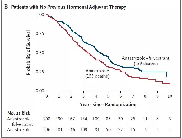SWOG0226一项由研究者发起、多中心、随机开放性研究,旨在比较阿那曲唑联合氟维司群和阿那曲唑单药相比在未接受过针对晚期疾病治疗的HR+乳腺癌的疗效。随机分组按照是否接受过他莫昔芬辅助用药进行分层。此研究中氟维司群为负荷剂量:500mg第1天;250mg第14和28天;每月250mg;PFS是主要研究终点,OS是预先设定的次要终点。