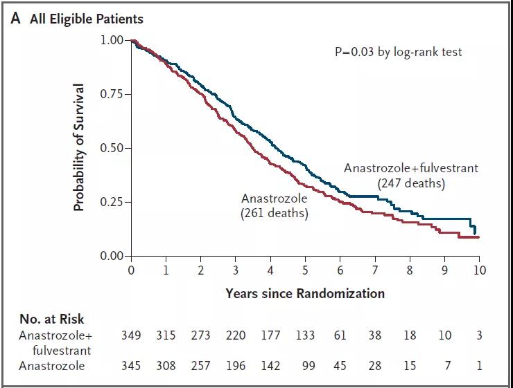 2019年3月新英格兰公布了随访7年的OS数据,在随机化入组的707例患者中,联合组和单药组发生OS事件的比例分别为71%(247/349)和76%(261/345);两组的OS分别为49.8月vs42.0月(HR=0.82; 95%CI:0.69-0.98;P=0.03)。在亚组分析中,未接受过他莫昔芬治疗组联合组OS获益更多(52.2月vs 40.3月);无病间期>10年的患者,从内分泌联合治疗中获益最大(65.4月 vs 49.7月,HR 0.69; 95% CI, 0.49-0.98)而且两组患者3-5级的长期毒性相似。本研究45%阿那曲唑单药组在进展后crossover到接受氟维司群单药治疗。