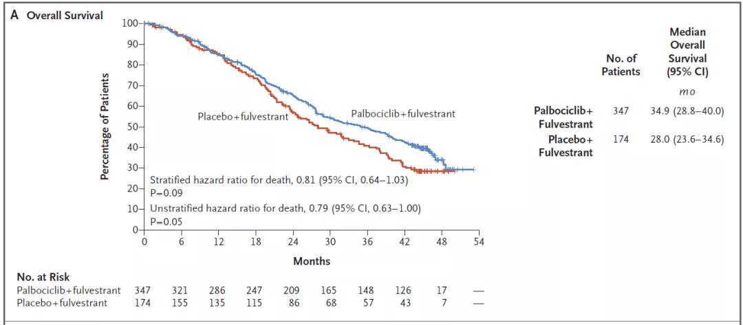 PALOMA-3研究纳入521例绝经前/围绝经期/绝经后既往内分泌治疗进展的HR+/HER2-晚期乳腺癌患者,随机2:1分配至氟维司群+palbociclib和氟维司群+安慰剂组。主要研究终点是PFS;次要终点是OS/ORR/CBR/患者报告/安全性;2015年新英格兰公布了PFS数据;palbociclib联合氟维司群显著延长PFS(9.2月vs 3.8月;HR=0.42;95%CI:0.32-0.56;P<0.001);2018年同样在新英格兰公布了其OS数据;palbociclib联合氟维司群较单药组延长6.9月(34.9月vs28.0月;HR=0.81,95%CI:0.64-1.03;P=0.09);虽然总人群中OS数据未取得差异,但将近7个月的临床绝对获益确实值得关注。另外亚组分析发现,之前对内分泌敏感的人群,联合组较单药组OS绝对获益10个月,且有统计学意义(39.7月vs29.7月;HR=0.72,95%CI:0.55-0.9;P=0.0081),而且联合组较单药组推迟了后续接受化疗的时间(HR=0.58,95%CI:0.47-0.73;P<0.001)。