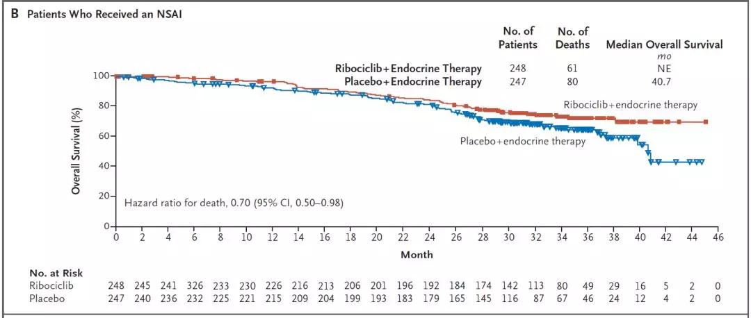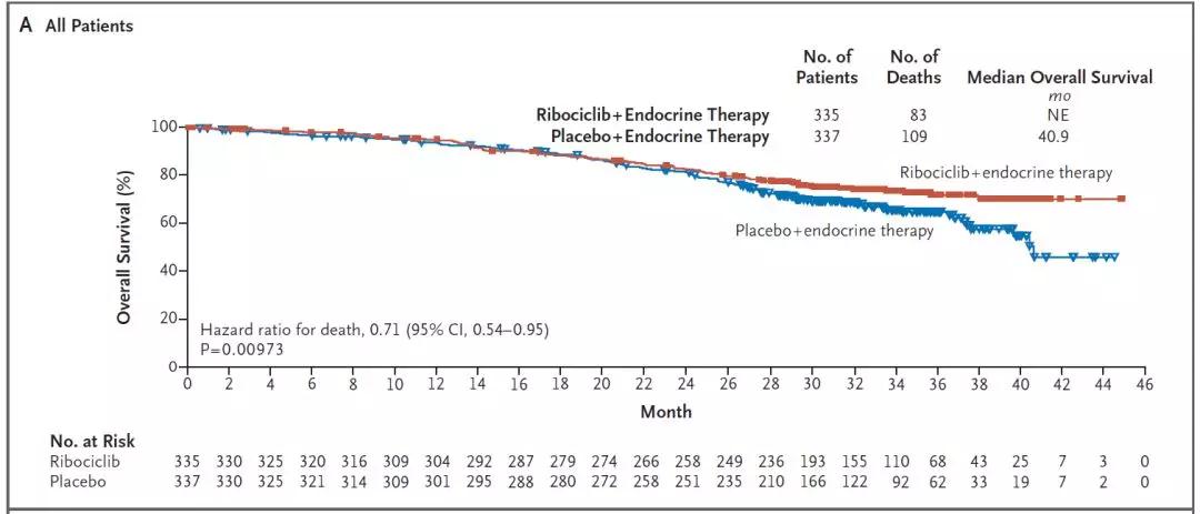 2019年6月在新英格兰公布了OS数据。结果发现Ribociclib联合内分泌可以显著延长OS;降低了29%的死亡风险;Ribociclib组患者OS未达到;安慰剂组为40.9月;两组42个月的OS率分别为70.2%和46%。对既定亚组进行OS分析,接受AI治疗的患者中;Ribociclib组和安慰剂组;预估42个月OS率分别为69.7%和43.0%(HR=0.70;95%CI:0.50-0.98);接受他莫昔芬治疗的患者中;预估42个月的OS率分别为71.2%和54.5%(HR=0.79;95%CI:0.45-1.38)。研究同时根据患者和疾病特征,既往治疗经历和入组地区;进行了探索性OS分析,均观察到Ribociclib组显著更优。