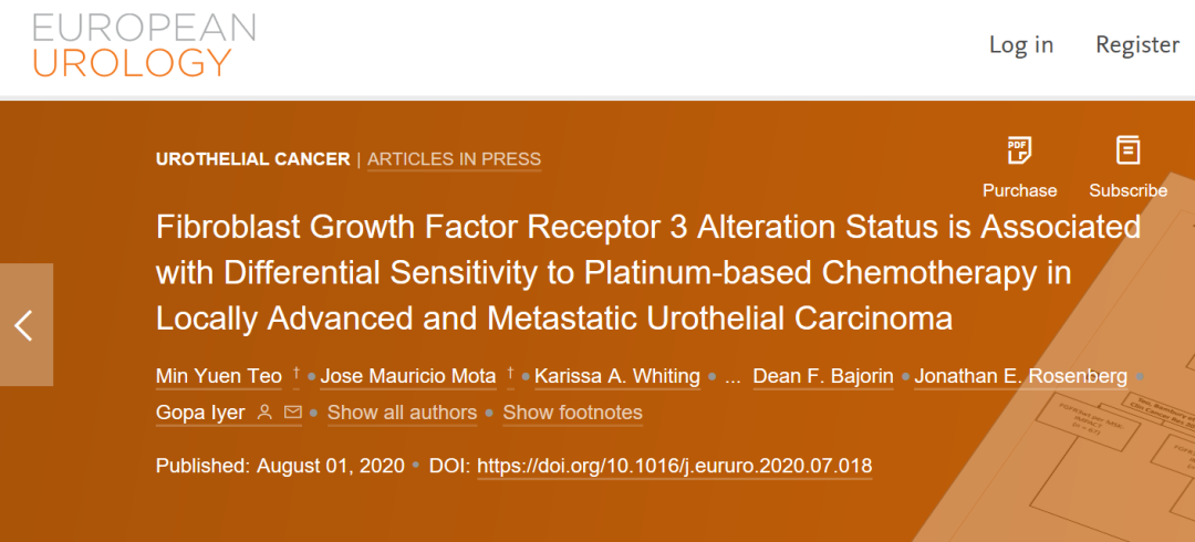 Teo MY, Mota JM, Whiting KA, et al. Fibroblast Growth Factor Receptor 3 Alteration Status is Associated with Differential Sensitivity to Platinum-based Chemotherapy in Locally Advanced and Metastatic Urothelial Carcinoma [published online ahead of print, 2020 Aug 1]. Eur Urol. 2020;S0302-2838(20)30566-2. doi:10.1016/j.eururo.2020.07.018