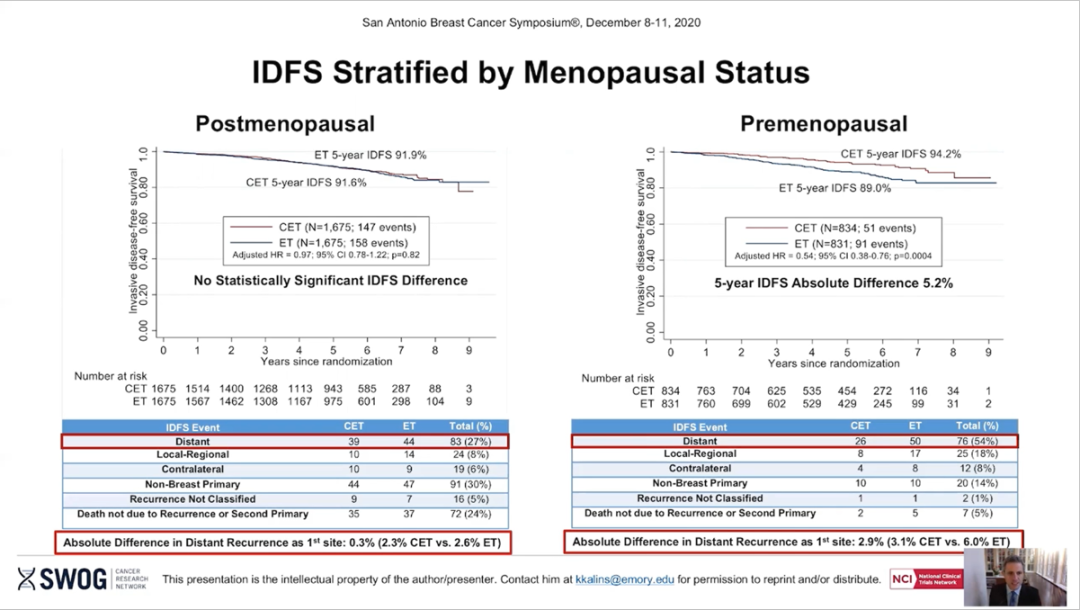 在HR+、HER2-、淋巴结1-3枚阳性、RS≤25分的患者中,绝经前患者可从化疗中得到iDFS和OS的显著改善,而绝经后者不能从化疗中获益。