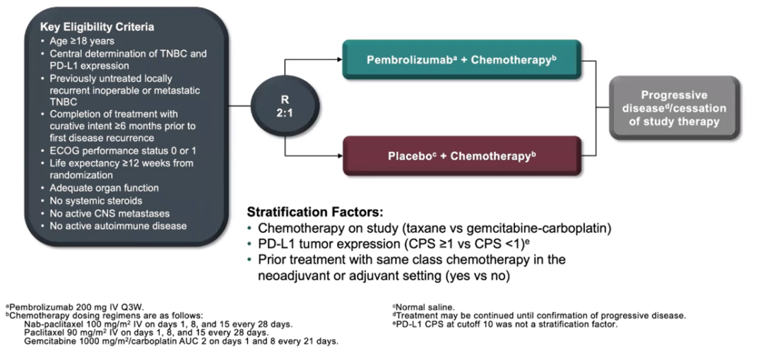 研究纳入847例未经治疗的转移性或初治的局部复发不可手术的mTNBC患者,按2:1随机分配接受pembrolizumab(200mg q3w)+化疗(白蛋白紫杉醇100mg/m2 dl,8,15 q4w,或紫杉醇90mg/m2  dl,8,15 q4w,或吉西他滨1000mg/m2 dl,8 q3w/卡铂AUC=2 ,dl,8 q3w)或安慰剂+化疗(剂量同研究组),至多给予35周期pembrolizumab或安慰剂,直至出现疾病进展或无法耐受的毒性。根据化疗类型(紫杉类vs吉西他滨/卡铂)、PD-L1状态(CPS≥1 vs<1)和之前(新)辅助治疗化疗方案是否相同(是vs 否)对患者进行分层。双重主要研究终点是PD-L1阳性患者(CPS≥10和≥1)和ITT人群的PFS和总生存(OS)。次要终点包括客观缓解率(ORR)、疾病控制率(DCR,定义为CR+PR+SD≥24周)、反应持续时间(DOR)。