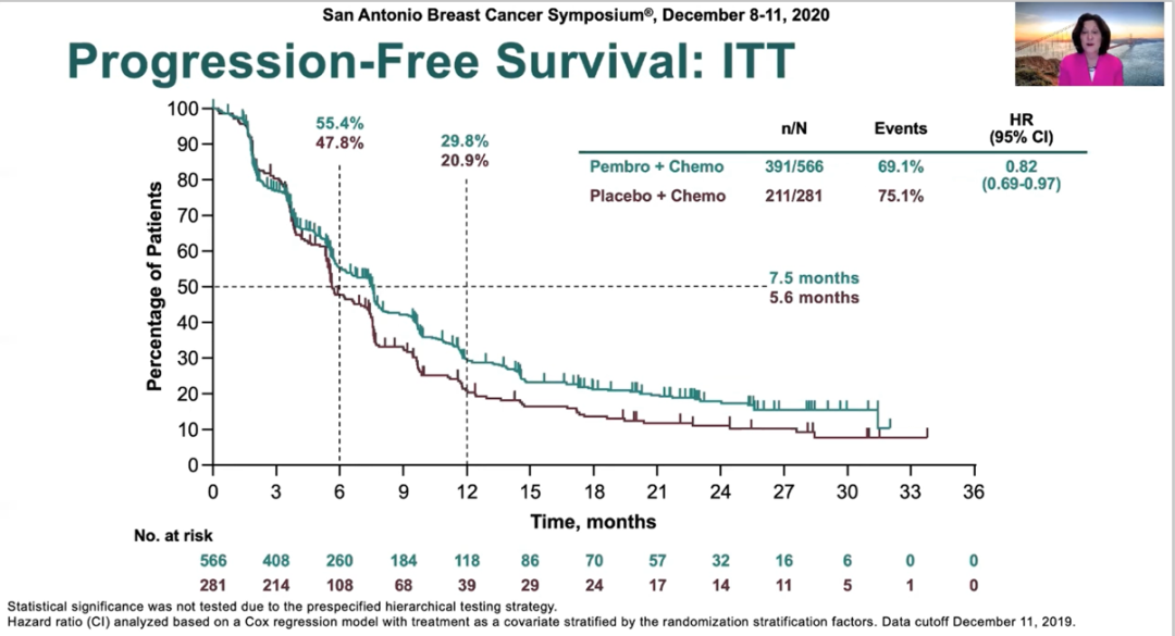 KEYNOTE-012、-086、-119试验均证实了在转移性三阴性乳腺癌(mTNBC)患者中pembrolizumab单药治疗具有持久的抗肿瘤活性和良好的安全性。此次大会报道的是pembrolizumab联合化疗对比安慰联合化疗一线治疗局部晚期不可手术或mTNBC的KEYNOTE-355研究无进展生存期(PFS)以及关键的次要研究终点的结果。