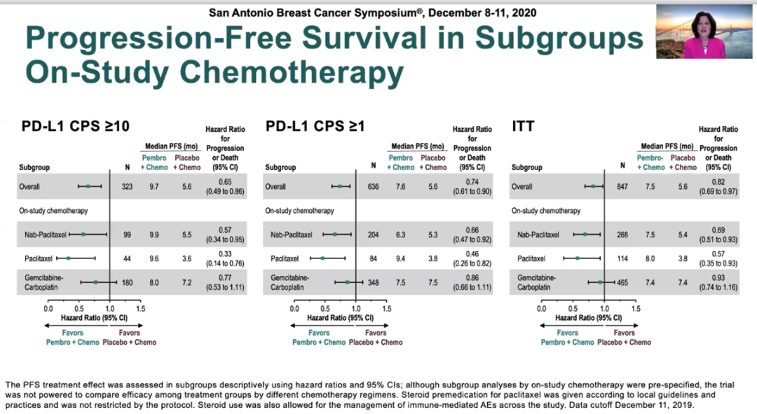 亚组分析中,无论配伍何种化疗方案,pembrolizumab+化疗均显著改善mTNBC的PFS。pembrolizumab+化疗的总体安全性和耐受性良好,没有新增的不良事件。