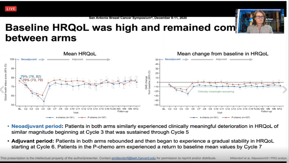 IMpassion031研究显示无论PD-L1表达,atezolizumab+化疗均显著提高了主要研究终点病理完全缓解(pCR)。本次大会报道了PROs,从患者角度全面评估临床效益和决策。