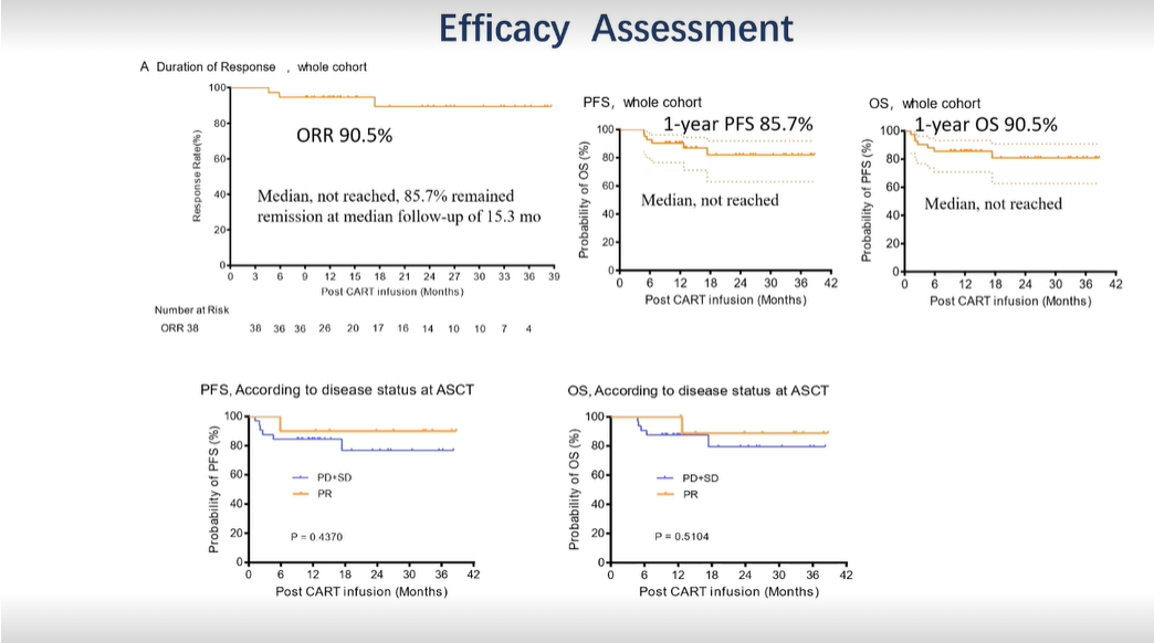 周剑峰教授:的确,这一研究设计之初,作为研究人员的我们也顾虑重重。首先实验设计的方案较为复杂,首先进行患者的化疗诱导后进行的自体移植接着再给予两种不同靶点的CAR-T细胞,开始我们也会担心这一方案是否会有较大的副作用,但实际结果来看包括CRS以及神经相关毒性都比较轻微。究其原因,其实CRS主要是因为体内形成记忆的巨噬细胞和T细胞导致的,而患者通过了自体移植前的化疗已经清除原有的免疫微环境,因此患者的重度的免疫风暴和不良反应显著降低。目前这一治疗模式在我们中心已经比较普遍且广泛应用。