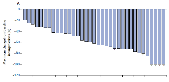 2、该研究尝试了针对HER2阳性胃食管腺癌患者一线去化疗的可能性。其中25例患者第一周期仅用曲妥珠单抗和帕博利珠单抗,却在56%的患者中取得了肿瘤缩小,这一结果令我们非常惊喜。我们不禁推测是不是有可能随着治疗时间延长,ORR会进一步提高?这意味着将来在这类人群中,临床治疗一线去化疗并非天方夜谭。