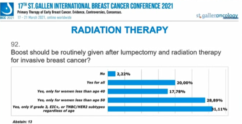 2.22%的专家持否定意见,20.00%持肯定意见,17.78%认为“年龄小于40岁”,28.89%认为“年龄小于50岁”,31.11%认为“无论任何年龄的G3、EIC+或TNBC/HER2+亚型”均可选择瘤床加量。