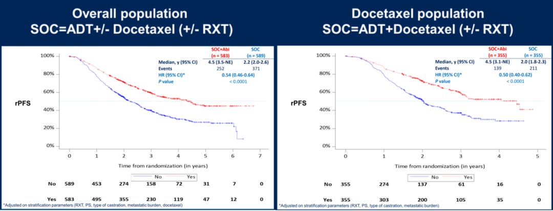 结果:2013年11月至2018年12月,共有1173名男性入组(710名患者SOC为ADT+多西他赛,463名患者SOC为单独ADT),中位年龄67岁(IQR:60-72),高负荷57%,低负荷43%。中位随访时间为3.5年。阿比特龙与RXT之间未检测到相互作用(P=0.64),允许将阿比特龙组合并进行比较。总体人群中阿比特龙组(中位数:2.2 vs 4.5年;HR 0.54,95%CI:0.46-0.64,P<0.0001)和ADT+多西他赛人群中阿比特龙组(中位数:2.0 vs 4.5年;HR 0.50,95%CI:0.40-0.62,P<0.0001)的rPFS均有显著改善。bPFS获益(PFS包括PSA进展作为一个事件)在总体人群(中位数:1.5 vs 3.8年;HR 0.40,95%CI:0.35-0.47,P<0.0001)和ADT+多西他赛人群中(中位数:1.5 vs 3.2年;HR 0.38,95%CI:0.31-0.47,P<0.0001)也倾向于阿比特龙组。OS尚未成熟。ADT+多西他赛人群中,前6个月内有超过5%的患者报告3-4级不良事件,包括阿比特龙组和对照组的中性粒细胞减少性发热(4.5% vs 5.4%)、肝毒性(19.7% vs 13%)和高血压(12.2% vs 8.6%)。