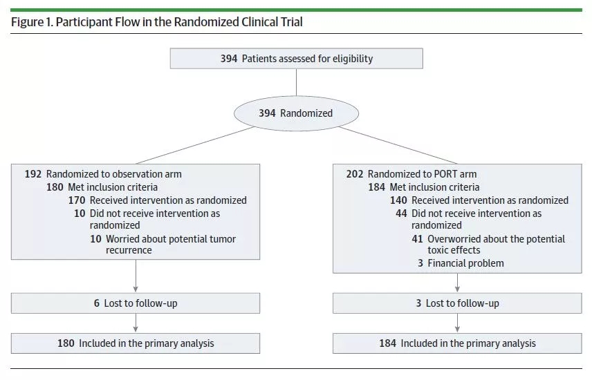 从2019年1月至2017年12月,共计394例患者接受筛查,364例患者符合入组标准并随机化,两组分别入组184例和180例患者并组成ITT人群。放疗组有23.9%的患者拒绝接受放疗,而观察组有5.6%的患者接受束流调强放疗。因此,共有310例患者组成符合方案集(图1)。