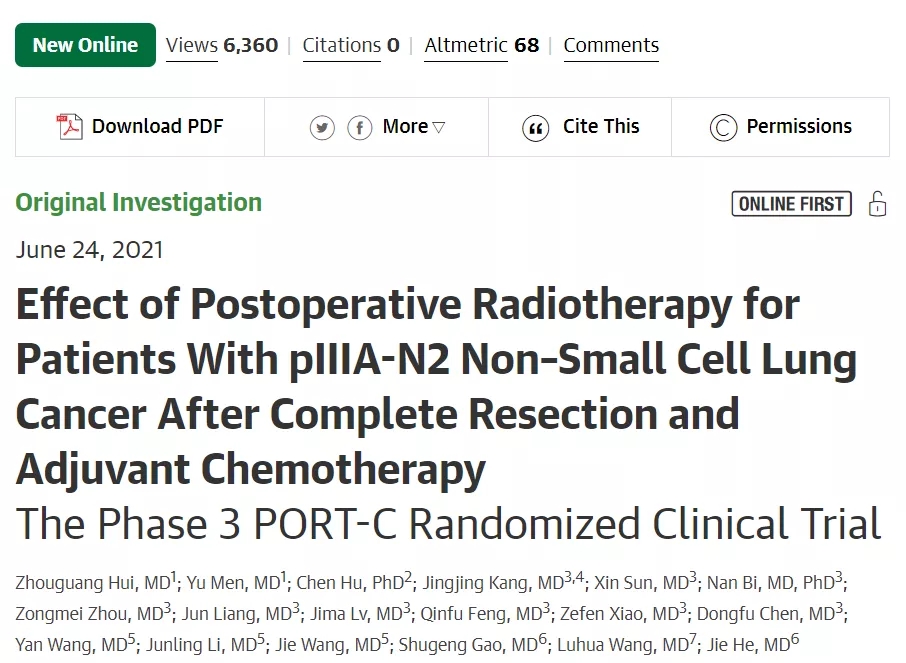 编者按:Ⅲa-N2的NSCLC患者是否需要接受术后辅助放疗一直存在极大争议,基于的循证医学证据均为回顾性证据且存在互相矛盾的地方。去年ESMO年会,Lung-Art研究数据公布,否决了这部分患者接受放疗的生存获益。近期,中国医学科学院肿瘤医院赫捷院士、王绿化教授团队在JAMA Oncology发表了PORT-C研究数据。这一研究结果和Lung-Art研究几乎一致。