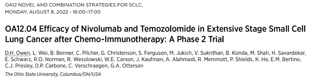 广泛期小细胞肺癌患者接受一线免疫联合化疗后一旦进展,后续治疗选择十分有限,替莫唑胺在广泛期小细胞肺癌患者中具有一定的疗效,但后线治疗数据有限。这项非随机、多队列、单中心、开放标签的II期临床研究评估了Nivolumab联合替莫唑胺在广泛期小细胞肺癌以及神经内分泌肿瘤中的疗效。本次单独报道广泛期小细胞肺癌患者队列的疗效。接受免疫联合化疗后进展的患者,接受Nivolumab固定剂量(480 mg,每4周一次)联合替莫唑胺150 mg/m2(每28天一周期,每周期第1-5天给药),主要研究终点为最佳响应率、PFS为及OS。