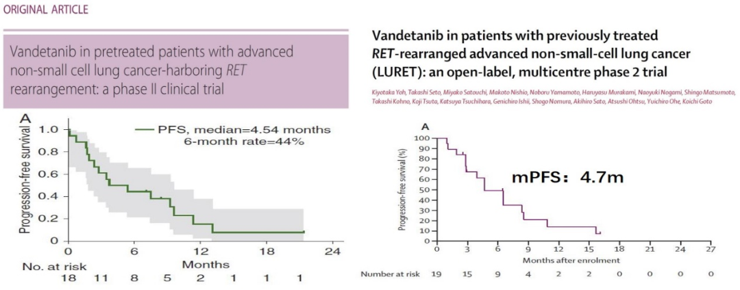 RET融合患者的治疗经历了三个时期:单纯化疗时代;以卡博替尼和凡德他尼为代表的多靶点TKI治疗时代及以BLU-667及Loxo-292为代表的精准治疗时代。含铂双药治疗是较早的治疗手段,但疗效十分有限。ORR约为30%,中位PFS约为5-6个月。进一步研究发现,以培美曲塞为基础的化疗方案相较于其他方案为基础的治疗可以给患者带来更大获益,两组中位PFS分别为9.2个月和5.2个月。