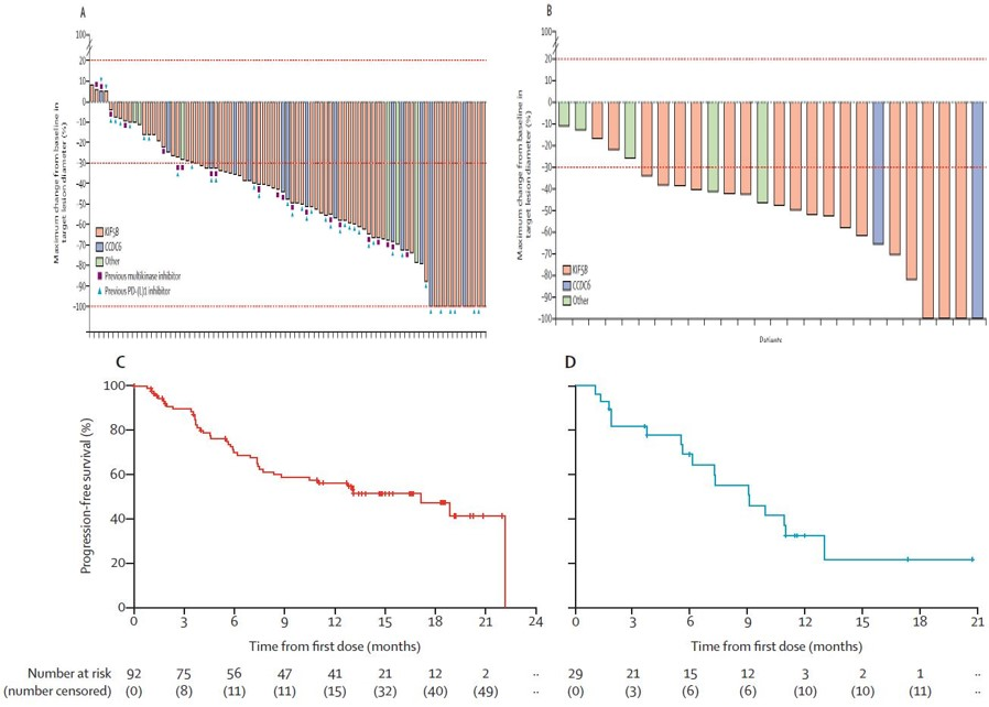 Blu-667(普拉替尼)及Loxo-292(塞尔帕替尼)两款药物是近年来研究较多的药物。Blu-667(普拉替尼)的1/2期临床研究(ARROW研究)的数据之前已经发表于Lancet Oncology杂志。在该研究中,基于I期的疗效及安全性数据,后续推荐的II期给药剂量为400mg,口服,每日一次。结果发现,经治患者的ORR为61%,中位PFS为17.1个月,中位OS尚未达到;初治患者的ORR为70%,中位PFS为9.1个月(初治患者PFS更差可能与入组患者均为不适合接受铂类药物治疗,一般状况较差导致的)。
