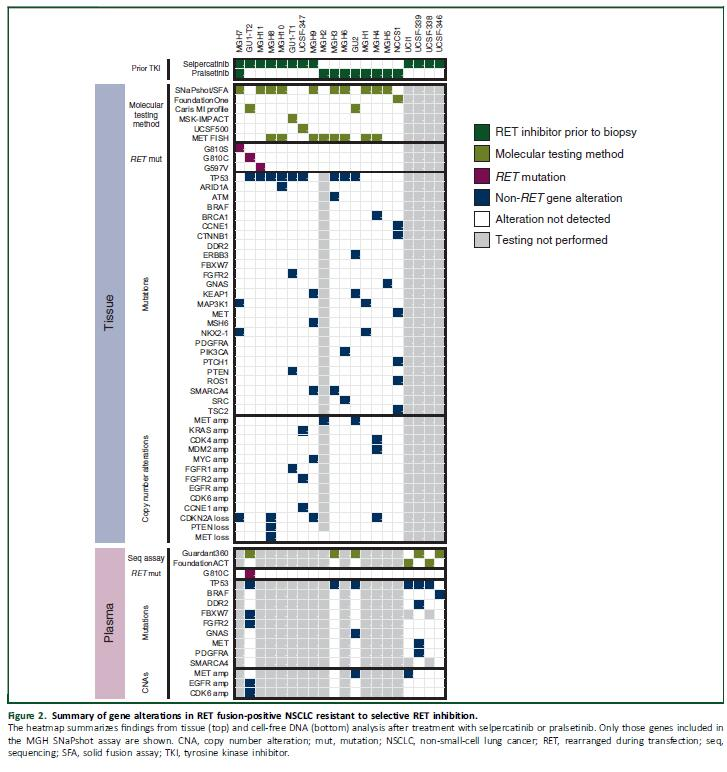 对于靶向治疗,除了疗效及安全性,临床最关心的另一个问题是耐药机制问题。2020年10月,来自麻省总院的研究者分析了接受Loxo-292和BLU-667治疗的患者耐药机制,研究结果发表于Annals of Oncology杂志。这项多中心、回顾性研究,共在美国5家研究中心进行,共计18例患者纳入研究,7例接受 BLU-667治疗,10例接受Loxo-292治疗,1例接受两种药物治疗。结果发现,10%的患者出现了发生于RET酪氨酸激酶域的突变,绝大多数发生在G810这个位点,包括G810S突变(该患者既往接受过多靶点TKI类药物治疗,以及 BLU-667治疗);另一突变类型为G810C突变。研究未发现小细胞或鳞状细胞癌转化机制,15%的患者携带MET扩增,所有患者均未携带 RET酪氨酸激酶域点突变,1例患者在接受Loxo-292治疗16.7个月后出现疾病进展,再次活检发现KRAS基因突变。