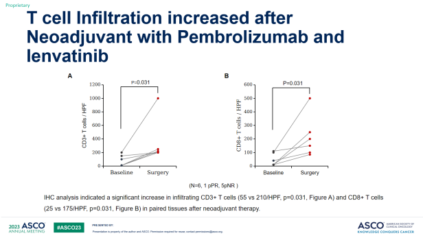 继阿昔替尼联合PD-1在黏膜新辅助中进行探索之后,在今年的ASCO会议上又报道了一项仑伐替尼+帕博利珠单抗用于黏膜新辅助的Ⅱ期临床研究结果。在初步报告的19例患者中,中位年龄57岁,女性占74%,最常见的原发灶部位是外阴阴道(42%)。15例患者接受手术治疗,其中2例达病理完全缓解(pCR),1例接近pCR,3例病理部分缓解(pPR),其他患者残余肿瘤病灶>50%。中位无事件生存(EFS)尚未达到,6例患者进行了新辅助治疗前后标本的检测,提示治疗后免疫微环境中浸润的CD3+、CD8+T细胞密度较前增加。