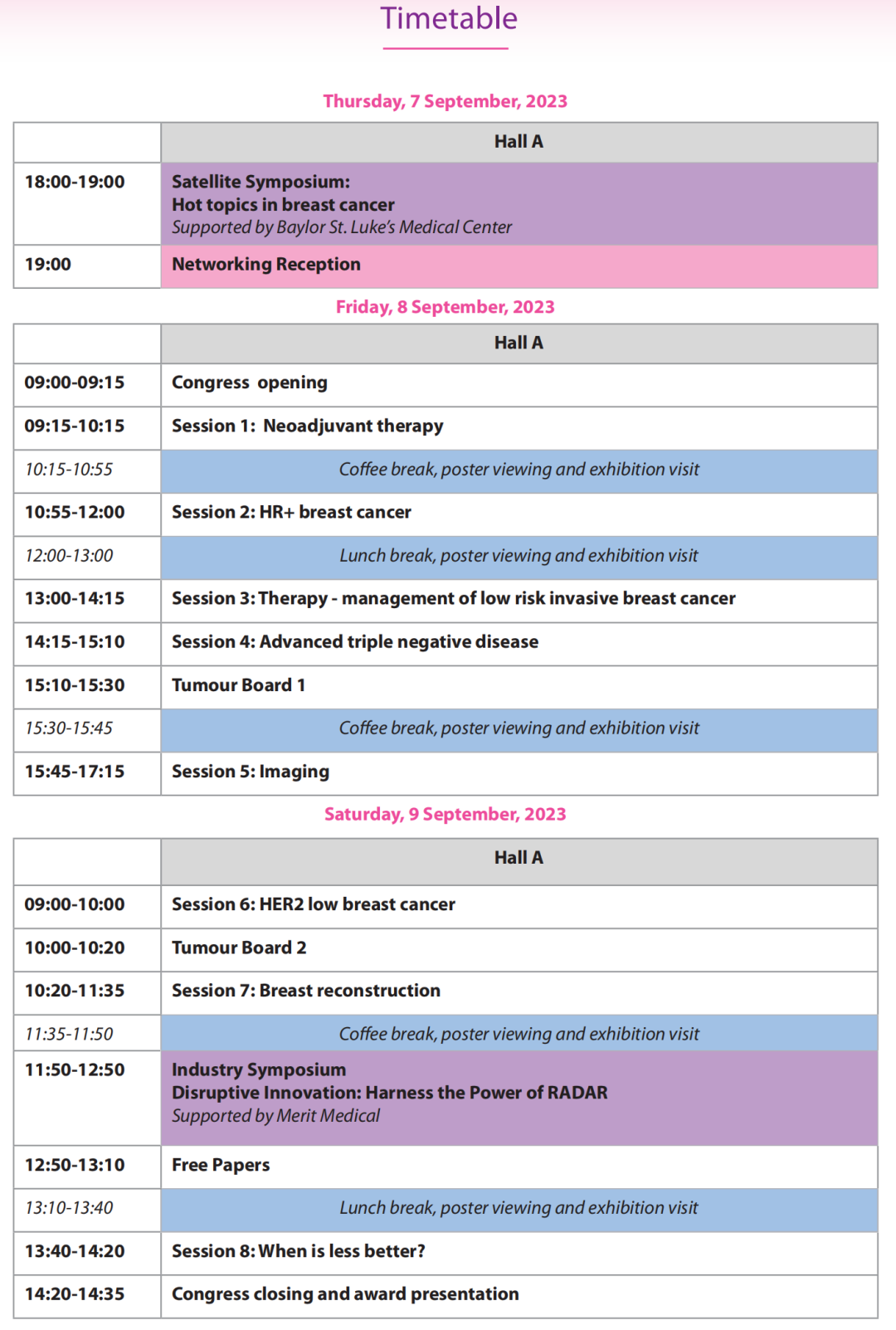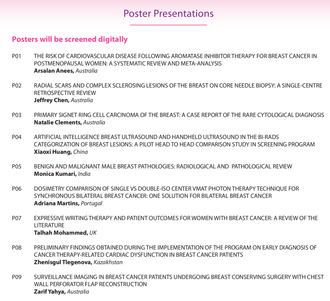 会议主题包含:乳腺影像学、筛查、预防、症状管理、局部区域治疗、分子检测、辅助内分泌治疗、新辅助治疗、乳腺癌遗传学、内分泌耐药、HER2阳性乳腺癌、免疫治疗、三阴性乳腺癌、导管原位癌、肿瘤精准治疗。