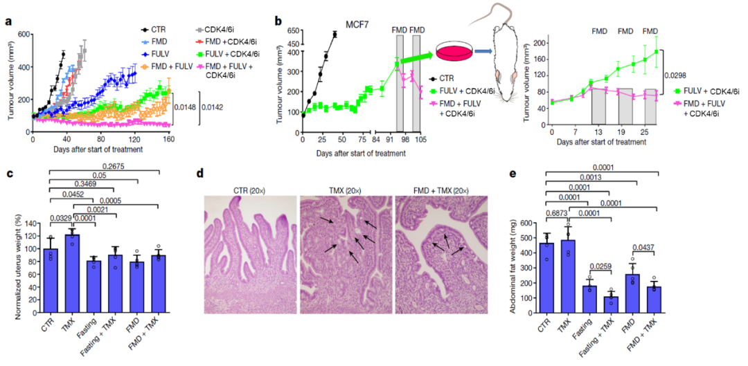 a)用随意饮食(n=15)、循环FMD(n=15)、氟维司群(n=16)、CDK4/6i(n=15)、FULV+CDK4/6i(n=18)、FULV+FMD(n=16)、CDK4/6i+FMD(n=10)或FULV+CDK4/6i+FMD(n=18)治疗的6-8周龄雌性NOD/SCIDγ小鼠中原位MCF7异种移植物的生长。b)左图,接种MCF7肿瘤细胞的6-8周龄雌性NOD/SCIDγ小鼠接受随意饮食(n=3)或FULV+CDK4/6i(n=6)治疗。在肿瘤进展时,接受过FULV+CDK4/6i治疗的小鼠开始接受每周一次的FMD。右图,对FULV+CDK4/6i具有获得性耐药的MCF7细胞进行离体扩增并重新移植;异种移植小鼠接受FULV+CDK4/6i(n=7)或FULV+CDK4/6i+FMD(n=10)治疗。c–e)六至八周大的雌性BALB/c小鼠接受5周的随意饮食(n=5)、TMX(n=5)、每周48小时禁食(n=5),FMD(n=5)、禁食+TMX(n=5)或TMX+FMD(n=5)。所有组的小鼠均在最后一个FMD或禁食周期结束时被处死。收集子宫、称重(c;子宫重量标准化为对照组小鼠的平均子宫重量)并固定用于组织学分析(d),收集腹内脂肪(性腺、腹膜后和肠系膜脂肪库)并称重(e)。