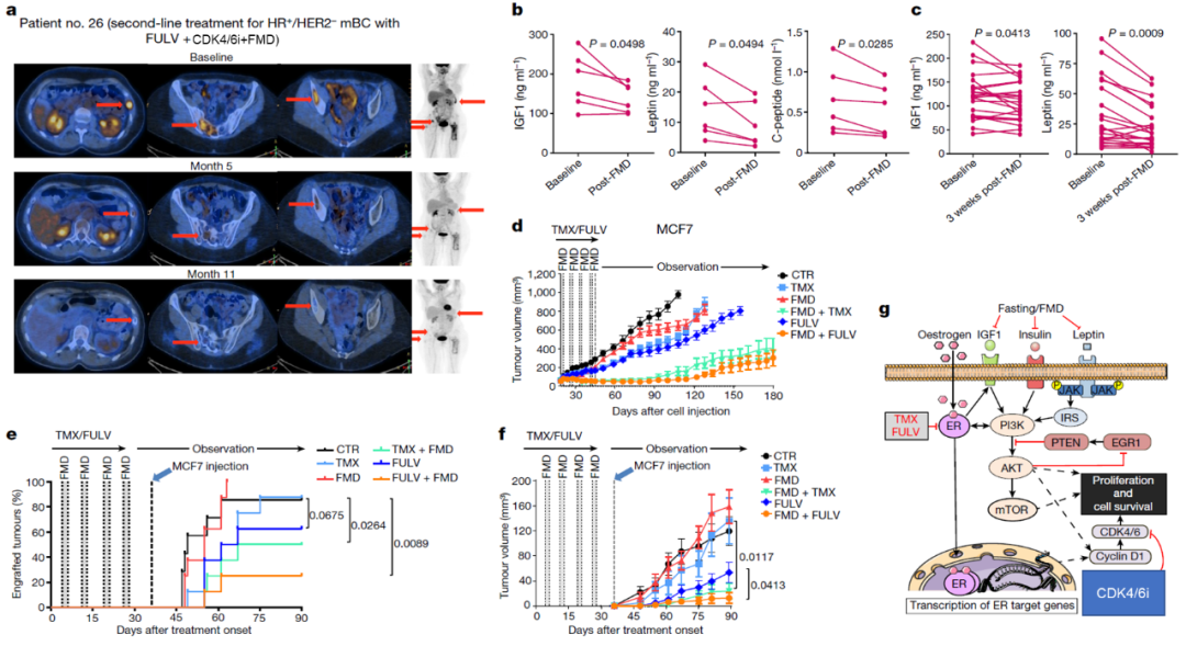a)HR+/HER2–转移性BC患者(mBC;患者26)的PET-CT结果,在氟维司群、CDK4/6i和FMD治疗后表现出完全代谢反应。b,c)HR+BC患者在接受ET和循环FMD(NCT03595540)治疗前和立即治疗时(b;n=6)或一个FMD周期之后三周(c;n=23)的血清IGF1、瘦素(b)和C肽(n=23)。d)MCF7细胞被移植到6-8周龄的雌性BALB/c裸鼠中。荷瘤小鼠接受随意饮食(n=16)、TMX(n=16)、FULV(n=18)、FMD(n=16)、TMX+FMD(n=16)或FULV+FMD(n=17)治疗1个月之后观察。e,f)MCF7在6-8周龄雌性BALB/c裸鼠中的接种和生长,这些小鼠移植前接受1个月的随意饮食(n=7)、TMX(n=8)、FULV(n=8)、FMD(n=8)、TMX+FMD(n=8)或FULV+FMD(n=8)。g)禁食或FMD与ET在PI3K-AKT-mTOR和CCND1信号传导通路上协同的假定模型。ER,雌激素受体;IRS,胰岛素受体底物。